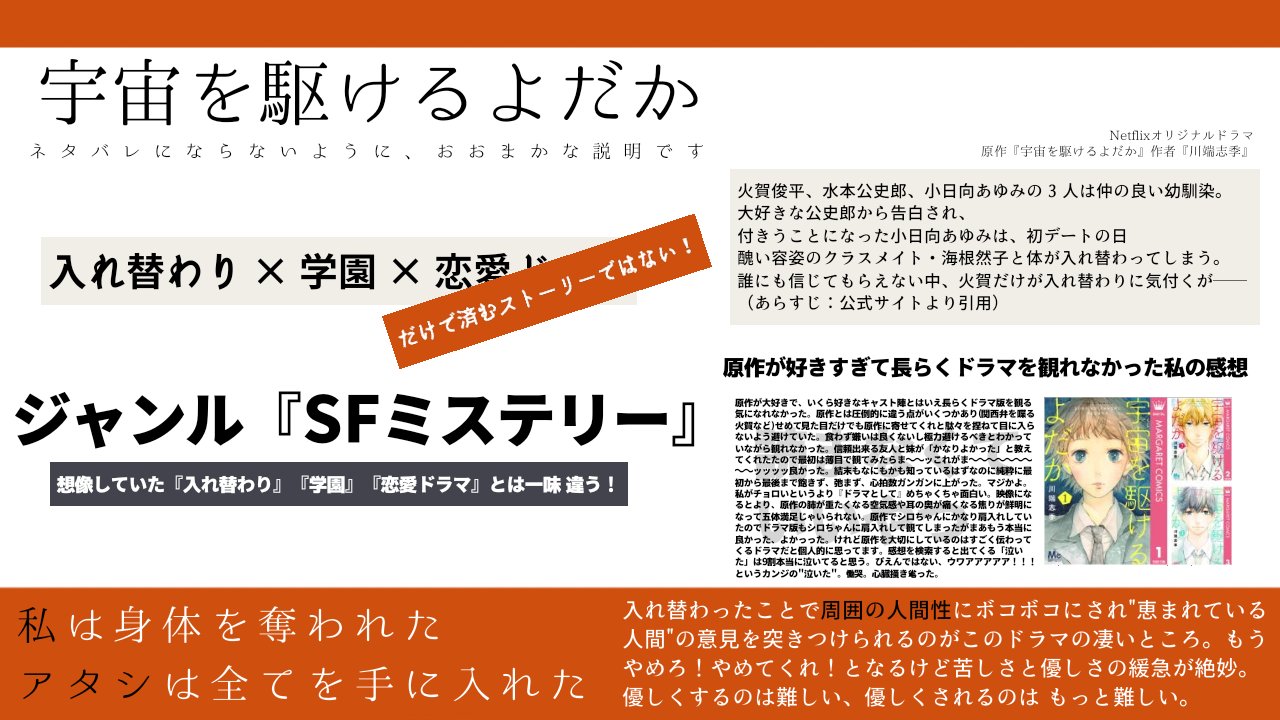 『宇宙を駆けるよだか』(そらをかけるよだか)は、川端志季による日本の漫画作品。『別冊マーガレット』(集英社)14年10月号から 15年12月号まで連載された 、単行本全3巻。 およびそれを原作としたドラマ。 Netflixにより重岡大毅と神山智洋のダブル主演で実写ドラマ化され、18年8月 作品は全て携帯でも見れます 同じような小説を簡単に作れます → 作成 この小説のブログパーツ 作者名:lemonS 作成日時:18年11月1日 18時 「宇宙を駆けるよだか」キャスト感想あらすじネタバレ評価★4漫画原作Netflixドラマ 結末は? 清原果耶NHK朝ドラ「おかえりモネ」主演俳優 「羊とオオカミの恋と殺人」感想あらすじ一部ネタバレキャスト評価★1福原遥サイコパス殺人鬼と恋?